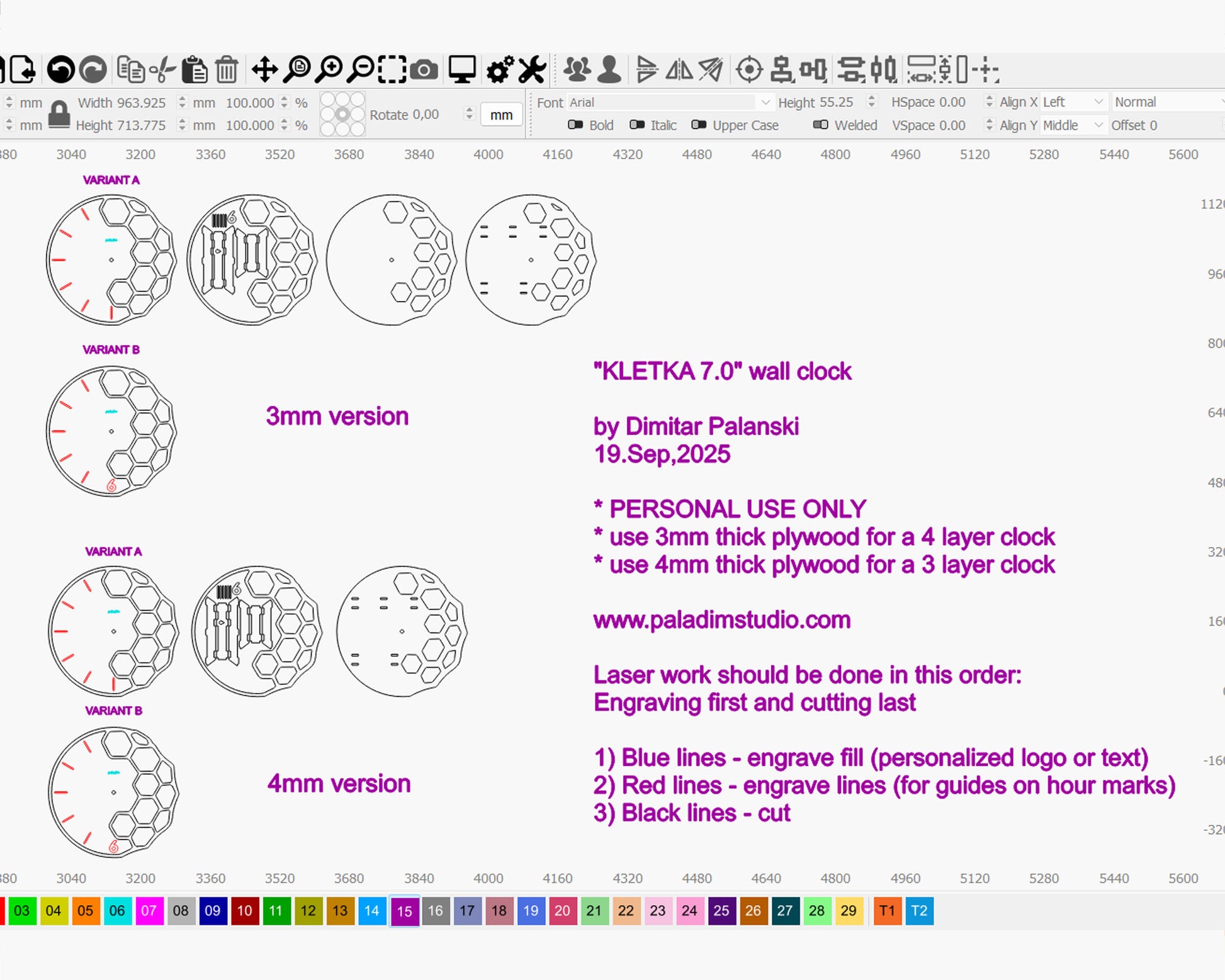 - I have made two variants - for 3mm or 4mm material thickness. The 3mm variant consists of 4 layers, while the 4mm variant is made of 3 layers, this way keeping the total thickness of the clock at 12mm :)